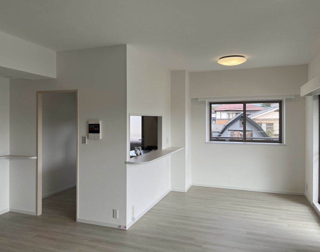 ダイニング部分はホワイト色で合わせ、清潔感とまとまりをもたせました。元から広さがあるリビングダイニングですが、お色を統一させることでもっと広々とした空間に感じることができるように。